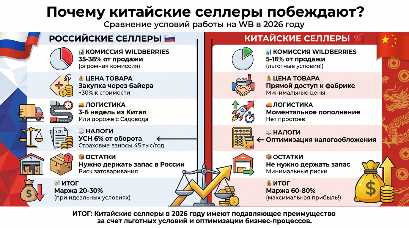 Ситуация кардинально изменилась за последний год. Китайские продавцы получили прямой доступ к российским маркетплейсам с беспрецедентными условиями. Их комиссия составляет 5-16% против 35-38% для российских селлеров. Такая разница позволяет удерживать демпинговые цены месяцами, вытесняя конкурентов.