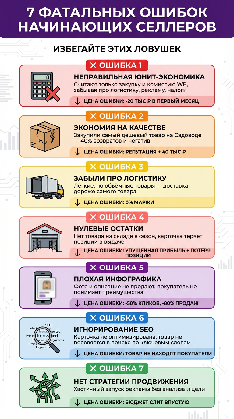 ❌ «Быстрые деньги» без вложений: если рассчитываете начать с 20-30 тысяч рублей и выйти на прибыль через месяц — этот путь не для вас. Маркетплейсы требуют системного подхода, постоянных инвестиций в рекламу и пополнение складов. Без понимания юнит-экономики вы просто потеряете деньги.